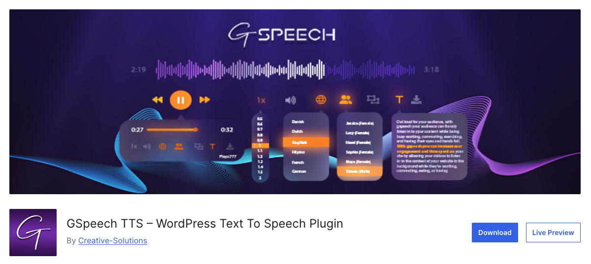 GSpeech is a leading modern Text To Speech WordPress Plugin, which uses Google Technology to generate the best audio and works on all devices and browsers! With 78+ available languages your site will be available to larger audiences worldwide.